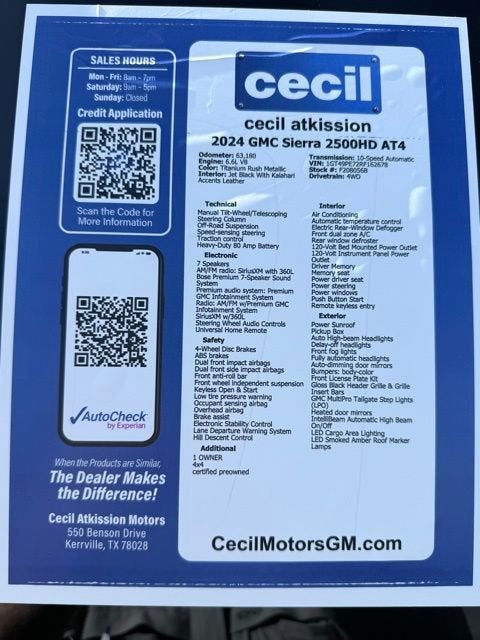 Titanium Rush Metallic 2024 GMC Sierra 2500HD AT4 4WD 10-Speed Automatic 6.6L V8 1 OWNER, 4x4, certified preowned, 10-Speed Automatic, 4WD, Jet Black With Kalahari Accents Leather, 120-Volt Bed Mounted Power Outlet, 120-Volt Instrument Panel Power Outlet, 2 Charge-Only Rear USB Ports, 2 Charge/Data USB Ports Inside Center Console, 2 USB Ports, 2-Speed Active Transfer Case, Adaptive Cruise Control, Apple CarPlay/Android Auto, AT4 Preferred Package, AT4 Premium Plus Package, Bed View Camera w/2 Trailer Camera Provisions, Bose Premium 7-Speaker Sound System, Cargo Convenience Package, Console-Mounted Safe (LPO), Deep-Tinted Glass, Electric Rear-Window Defogger, Floor-Mounted Center Console, Front Prem Floor Liners w/Removable Carpet Insert, Front Rain-Sensing Wipers, Gloss Black Header Grille & Grille Insert Bars, GMC Connected Access Capable, HD Surround Vision, Heated 2nd Row Outboard Seats, Heated Driver & Front Outboard Passenger Seats, Hill Descent Control, Inside Rearview Auto-Dimming Rear Camera Mirror, Integrated Trailer Brake Controller, Keyless Open & Start, LED Cargo Area Lighting, LED Smoked Amber Roof Marker Lamps, Manual Tilt-Wheel/Telescoping Steering Column, Multicolor 15 Diagonal Head-Up Display, Off-Road High Clearance Step (LPO), OnStar & GMC Connected Services Capable, Power driver seat, Power Front Passenger Windows w/Express Up/Down, Power Sliding Rear Window w/Defogger, Power Sunroof, Preferred Equipment Group 4SB, Premium audio system: Premium GMC Infotainment System, Push Button Start, Rear Cross Traffic Alert, Rear Prem Floor Liners w/Removable Carpet Insert, Rear Underseat Storage (LPO), Rear Wheelhouse Liners, Remote Vehicle Starter System, Safety Alert Seat, SiriusXM w/360L, Spray-On Bedliner w/AT4 Logo, Steering Wheel Audio Controls, Technology Package, Trailer Cam Provisions & Trailer Viewing Software, Trailer Side Blind Zone Alert, Ultrasonic Front & Rear Park Assist, Unauthorized Entry Theft-Deterrent System, Universal Home Remote, Ventilated Driver & Front Passenger Seats, Wireless Charging, Wireless Phone Projection, X31 Off-Road Package.